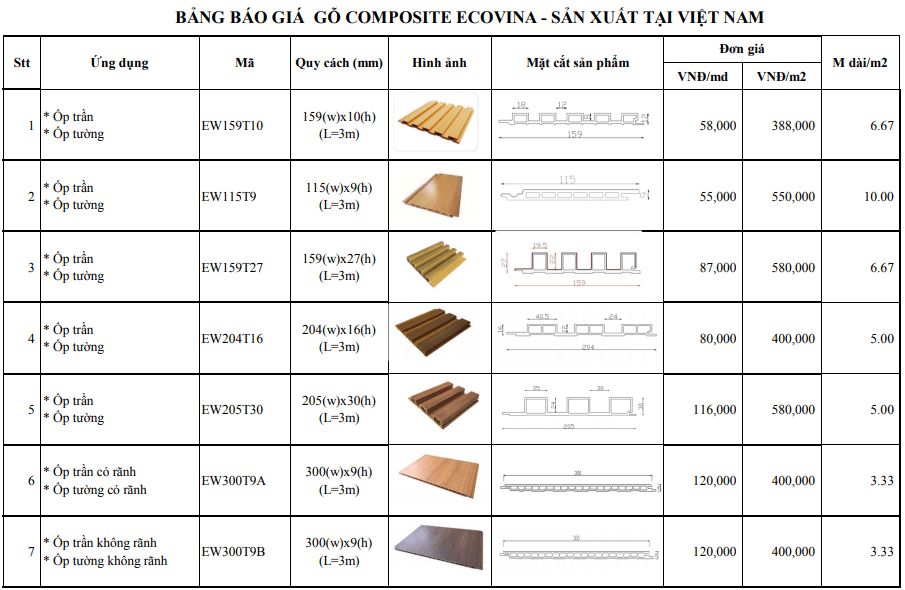 bảng báo giá các sản phẩm gỗ nhựa Ecovina :