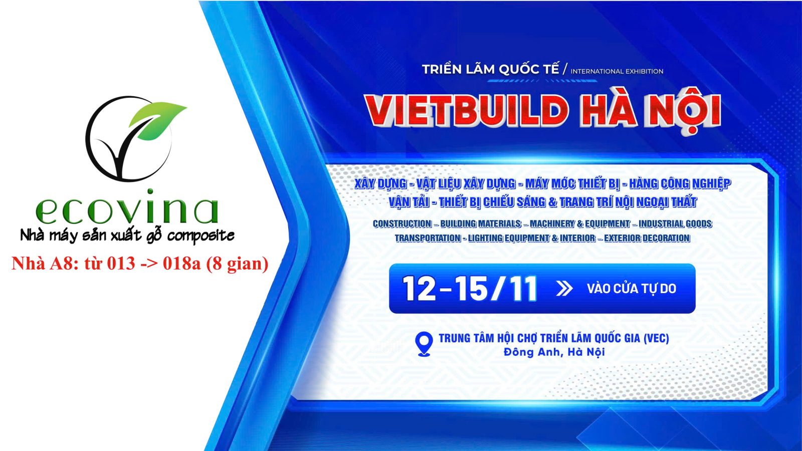 Chúng tôi trân trọng thông báo rằng nhà máy gỗ nhựa Ecovina sẽ tham gia Triển lãm Quốc tế VIETBUILD HÀ NỘI 2025 – sự kiện thường niên hàng đầu trong lĩnh vực xây dựng, vật liệu xây dựng, bất động sản, trang trí nội ngoại thất và thiết bị gia dụng.